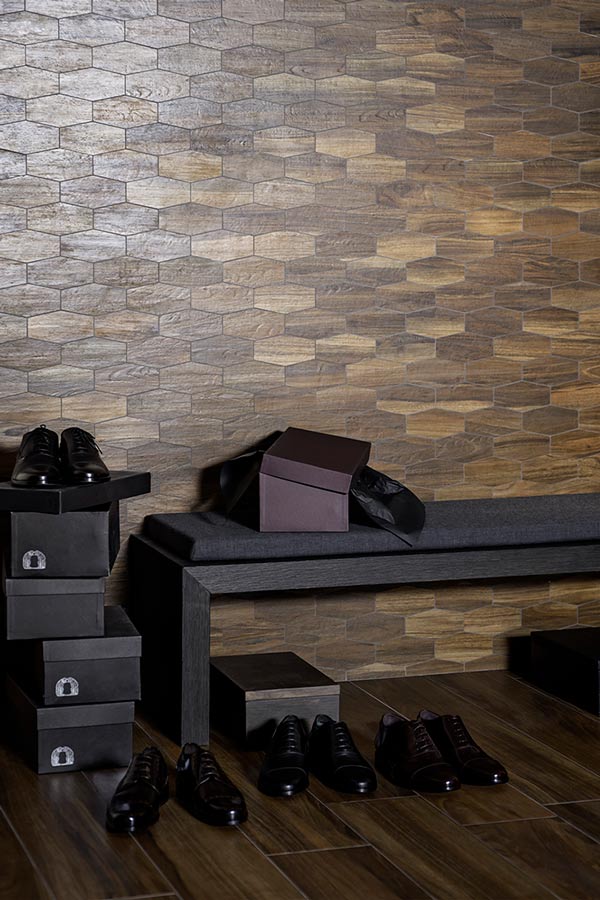 Además, el catálogo de Marazzi propone una gran variedad de formatos medianos y grandes para los azulejos de gres de imitación de la madera: tablas, listones, listelos —incluso para la colocación en espiga a la francesa o húngara o chevron—, quadrotte, mosaico clásico y de piezas hexagonales.